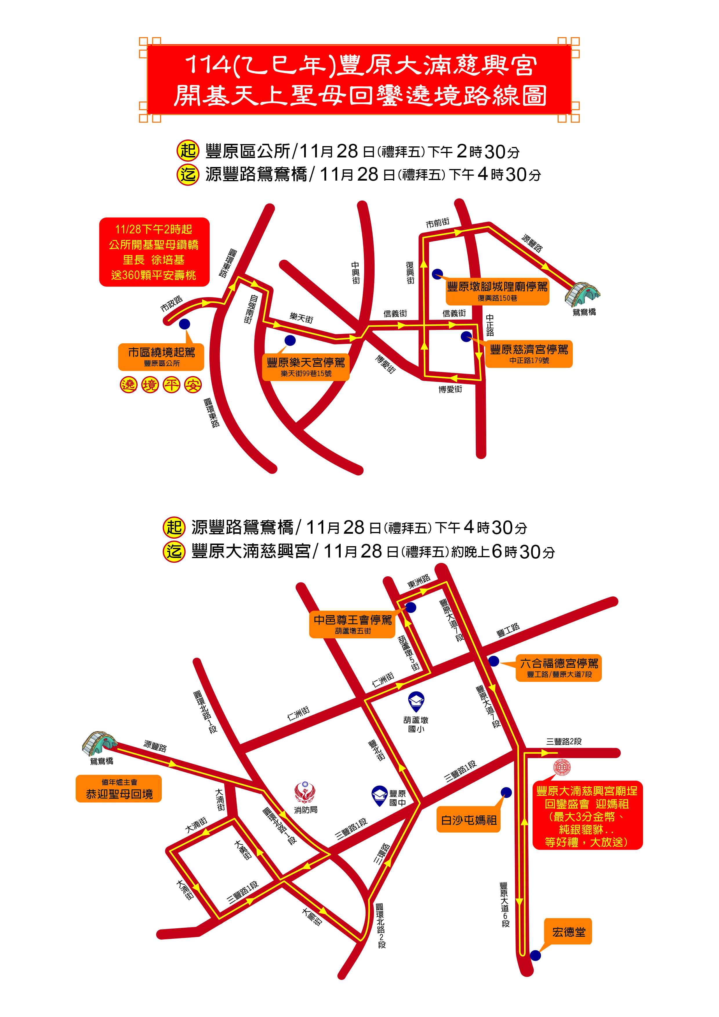 | 下午2點 | 豐原區公所迎駕團拜/開基聖母鑽轎里長 徐培基送360顆平安壽桃/開基媽遶境 | ||